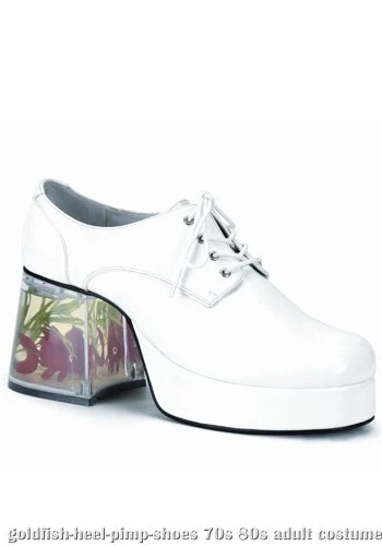 Goldfish heel pimp shoesNo self respecting pimp would walk down the street in any shoe but these gold fish pimp shoes. This classic platform shoe is made from a glossy vinyl-like material giving it a shine befitting of any pimp. The heel is transparent, revealing two small toy goldfish encased in water. The fish have a gyroscopic balance and remain horizontal no matter which direction the shoes move. The small encasement also includes some fake plants, to recreate what the fish are used to experiencing in the wild. The bottom the shoe has grooved treads for extra stability while walking. Tell everyone you know how to make the green and take care of business by wearing these super fly shoes.