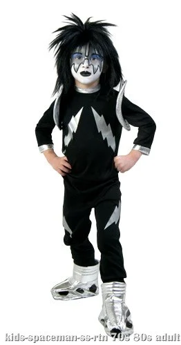 JumpsuitArmbandsBoot CoversWigThis kids screenprinted Spaceman costume is an officially licensed KISS costume! It consists of a black, polyester jumpsuit that velcros in the back for closure. The sleeves are three-quarter length with shiny, silver trim around the cuffs. The same trim also lines the neck. Silver lightening bolts are screenprinted on the torso and legs. The silver armbands are made from foam and snap onto the shoulder. The shiny silver boot tops are lined with black circles and are secured in place with elastic. The cuff and top of the foot are made from foam. The black wig features Spaceman’s signature hairstyle and lined with mesh on the interior. Add our Spaceman mask or makeup for a complete look!