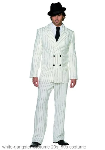 JacketPantsTieBecome the mafia boss with this mens white gangster costume. The striped jacket is made out of 100% polyester and includes shoulder pads to achieve a full, masculine appearance. It uses velcro snaps in the front for easy changing, and includes decorative black buttons along the front. The jacket also includes stylish faux pockets. The included pants are made of 100% polyester which have an elastic band in the waist for added comfort. The pants also contain a back pocket. The black tie fits easily around the neck with an elastic band. Be ready with your Tommy gun because the cops will be on your tail!