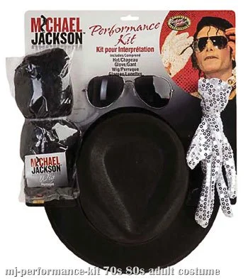 HatWigGlassesGloveSteal the show with this Michael Jackson performance kit! Great for any Michael fan, this kit includes a black fedora hat that has a circumference of 22″. The white glove is covered in silver sequins and the wig features Michael’s signature hairstyle. It is lined with mesh on the interior for a comfortable fit. A pair of aviator-like glasses are also included. Belt out all of your favorite Michael tunes in this licensed performance kit!