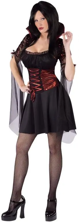 Costume includes: Low-cut black dress with stand-up collar and lace sleeves that drape from the elbow, attached lace up corset in iridescent red.