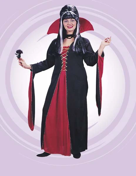 Blood Sucker!Costume includes: Floor length, lace-up gown in black and red with gold trim, draped sleeves, and stand up collar with attached choker. Available sizes: