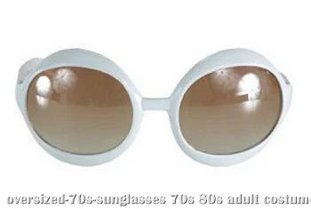 White Oversize SunglassesRock out like the legendary Elton John in these White 70s Sunglasses. These sunglasses have large, round lens that are tinted. They are UV 400 and will protect your eyes from the sun. The white frame is thin and gets thicker around the lens. Rectangle and circle cutouts embellish the side of the sunglasses. These funky sunglasses are made for both men and women.